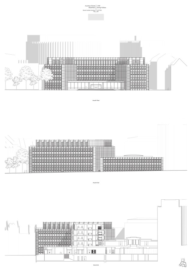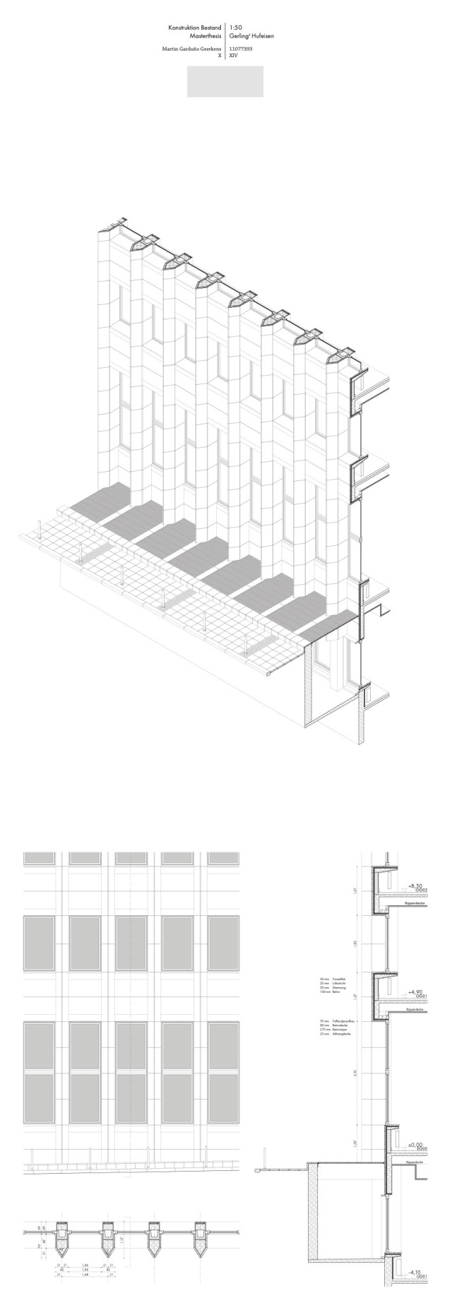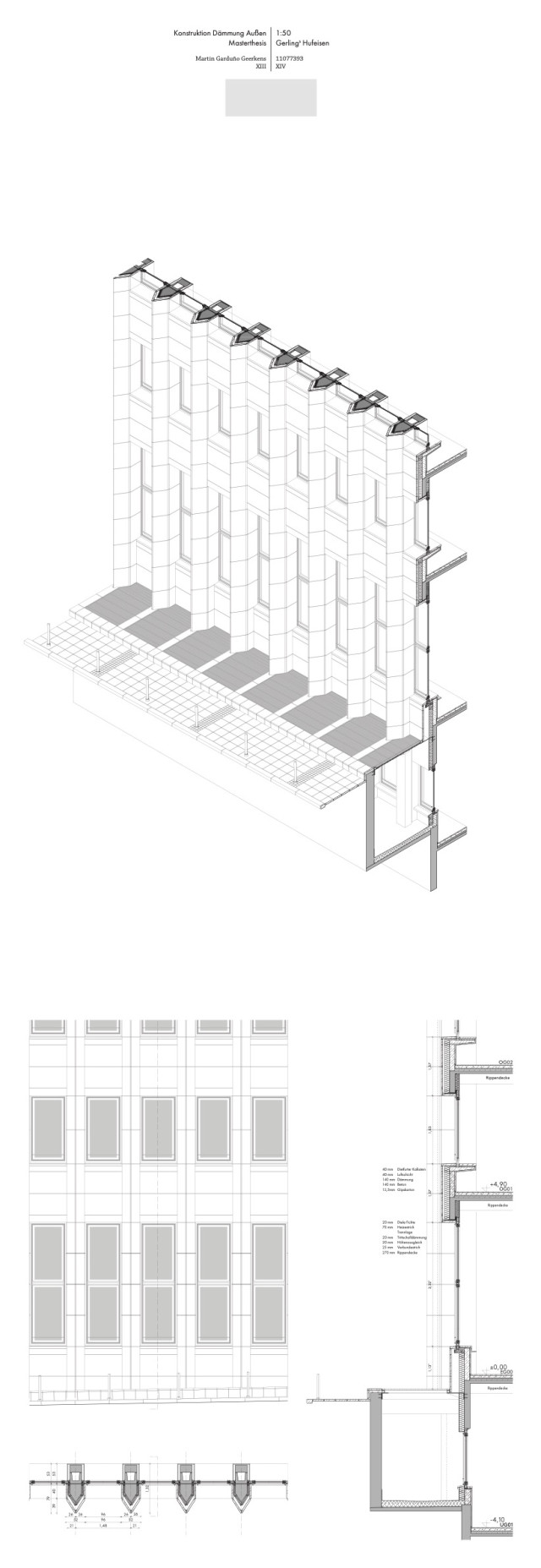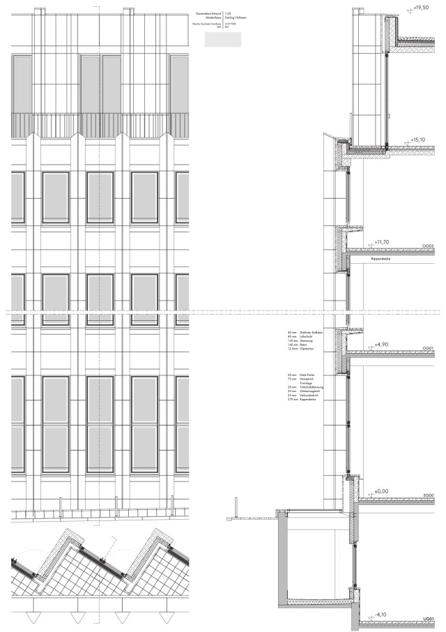 Gerade der Umgang mit der alten Substanz sollte aufgrund der repräsentativen Architektursprache des Quartiers zwar subtil ausfallen, jedoch gleichzeitig die vorhandene Struktur in die aktuelle Zeit transportieren. Die städtebauliche Prägnanz des Viergeschossers wird hier durch einen eingeschossigen, leicht zurückgesetzten Aufbau mit schräggestellter Fassade verstärkt, welcher das Gebäude tiefer in den städtischen Kontext einbindet und gleichzeitig einen subtilen Bruch in der geschossübergreifenden Fassadenstruktur bildet. Für die Bestandsfassade wurden drei konstruktive Varianten erarbeitet. Bei der ersten Variante, einer innenliegenden Dämmschicht, bliebe die Bestandsfassade zwar unberührt, eine vollständige thermische Abtrennung des Außenraums wäre allerdings nicht gewährleistet. Gleichzeitig würde dies einen starken Eingriff in die innenräumlichen Strukturen des Baus bedeuten. Eine zweite Möglichkeit böte das Ersetzen der bestehenden Dämmschicht durch Vakuumdämmung, welche jedoch aufgrund ihrer Unwirtschaftlichkeit nicht weiter verfolgt wird. Außerdem ist bei Entfernung und Lagerung der bestehenden Natursteinplatten deren Unversehrtheit nicht sicherzustellen. Vereinzelte Platten müssten ausgetauscht werden und das Bild eines Flickenteppichs würde entstehen, das der architektonischen Qualität des Quartiers nicht gerecht würde. Als Quintessenz wird die dritte Konstruktionsvariante gewählt. Hierbei würde die bestehende Fassade vollständig rückgebaut und durch in Qualität und Erscheinung äquivalenten Naturstein als Vorhangfassade mit dahinter liegendem Dämmpaket ersetzt.