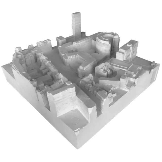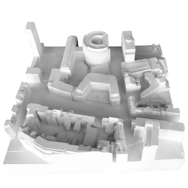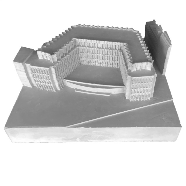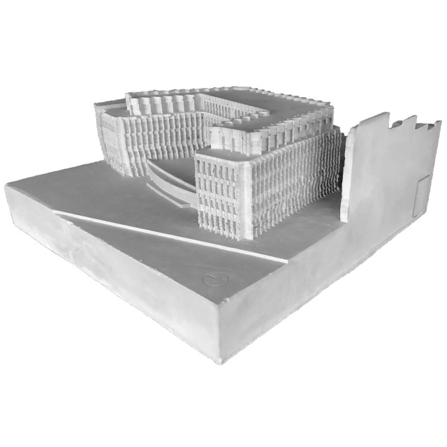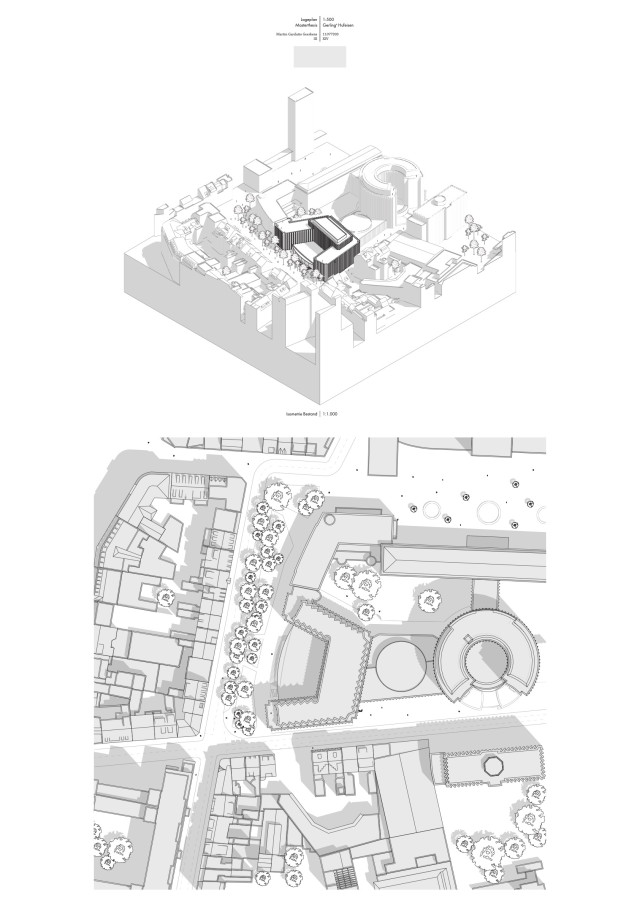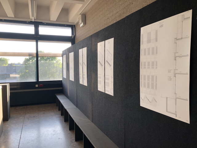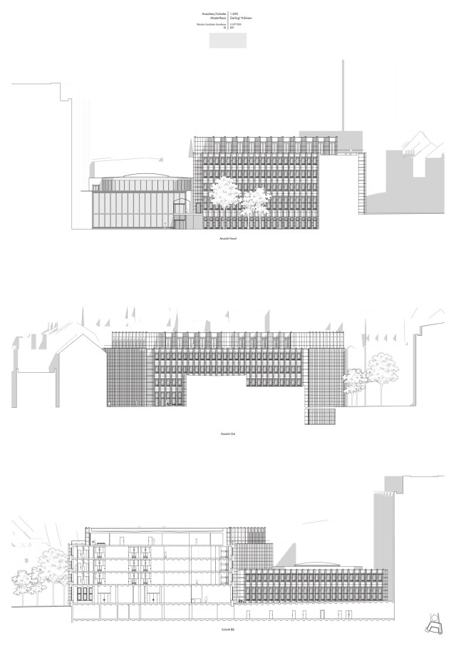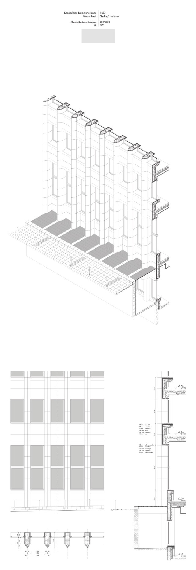 Gerade der Umgang mit der alten Substanz sollte aufgrund der repräsentativen Architektursprache des Quartiers zwar subtil ausfallen, jedoch gleichzeitig die vorhandene Struktur in die aktuelle Zeit transportieren. Die städtebauliche Prägnanz des Viergeschossers wird hier durch einen eingeschossigen, leicht zurückgesetzten Aufbau mit schräggestellter Fassade verstärkt, welcher das Gebäude tiefer in den städtischen Kontext einbindet und gleichzeitig einen subtilen Bruch in der geschossübergreifenden Fassadenstruktur bildet. Für die Bestandsfassade wurden drei konstruktive Varianten erarbeitet. Bei der ersten Variante, einer innenliegenden Dämmschicht, bliebe die Bestandsfassade zwar unberührt, eine vollständige thermische Abtrennung des Außenraums wäre allerdings nicht gewährleistet. Gleichzeitig würde dies einen starken Eingriff in die innenräumlichen Strukturen des Baus bedeuten. Eine zweite Möglichkeit böte das Ersetzen der bestehenden Dämmschicht durch Vakuumdämmung, welche jedoch aufgrund ihrer Unwirtschaftlichkeit nicht weiter verfolgt wird. Außerdem ist bei Entfernung und Lagerung der bestehenden Natursteinplatten deren Unversehrtheit nicht sicherzustellen. Vereinzelte Platten müssten ausgetauscht werden und das Bild eines Flickenteppichs würde entstehen, das der architektonischen Qualität des Quartiers nicht gerecht würde. Als Quintessenz wird die dritte Konstruktionsvariante gewählt. Hierbei würde die bestehende Fassade vollständig rückgebaut und durch in Qualität und Erscheinung äquivalenten Naturstein als Vorhangfassade mit dahinter liegendem Dämmpaket ersetzt.